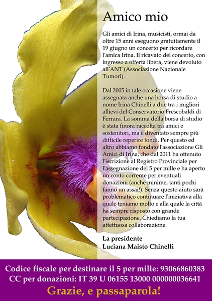Come ogni anno, mi permetto di scrivere per invitarvi al concerto in memoria di mia sorella Irina, organizzato da mia madre e dagli amici di Irina.