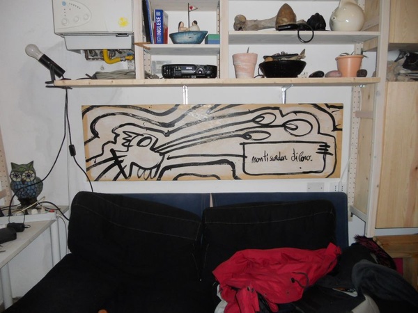 Tela, cartone, carta, legno, tappeti, muri, soffitti, e di nuovo tela, carta su tela, colori, schizzi, vernici, sabbia, giornali vecchi, carta da parati, timbri.